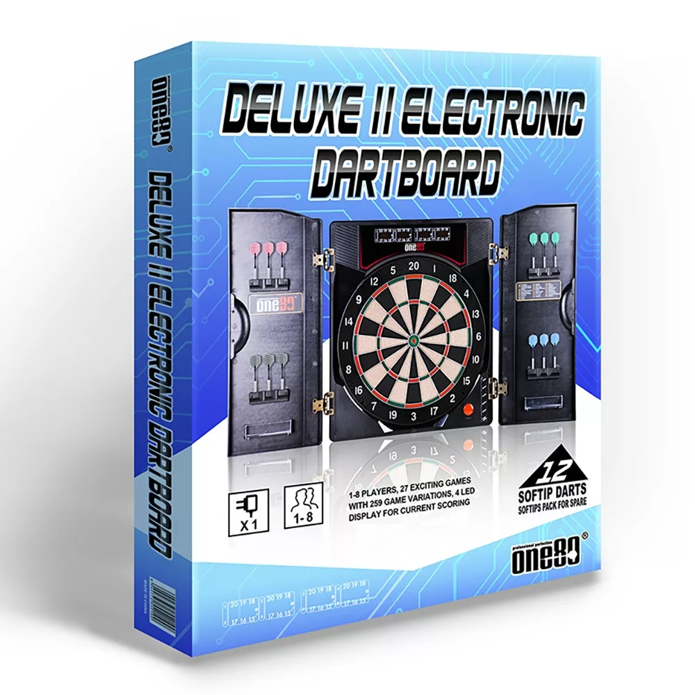 One80 DeLuxe II je profesionální elektronický terč se stylovou skříňkou, určený pro domácí použití. Nabízí širokou škálu funkcí a her, které potěší začátečníky i zkušené hráče. Díky pevné konstrukci a přesnému snímání zásahů si užijete hodiny zábavy i tréninku.