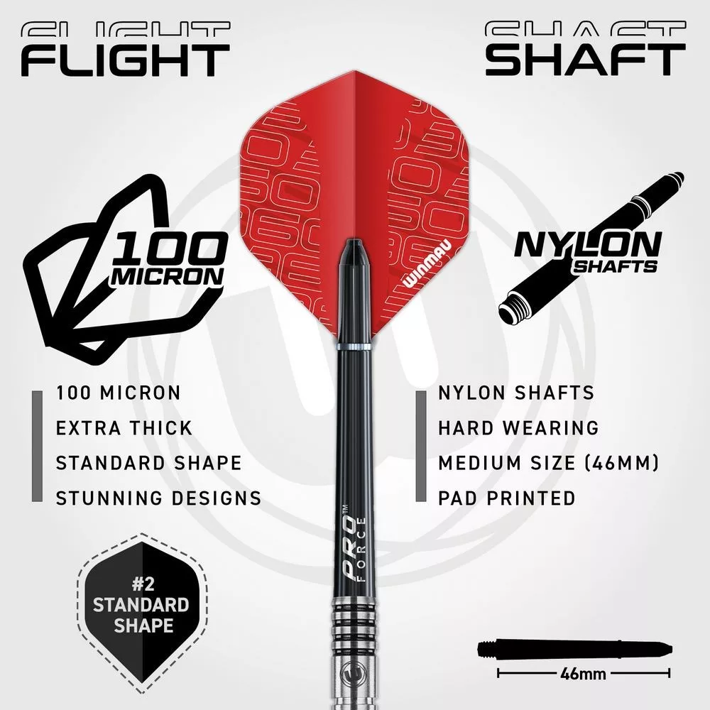 Součástí jsou dva sety šipek Winmau Navigator 3 s váhou 23 g, vybavené dlouhými ProForce nylonovými násadkami a dvěma barvami letkového provedení 360 pro snadnou identifikaci a stabilní let.