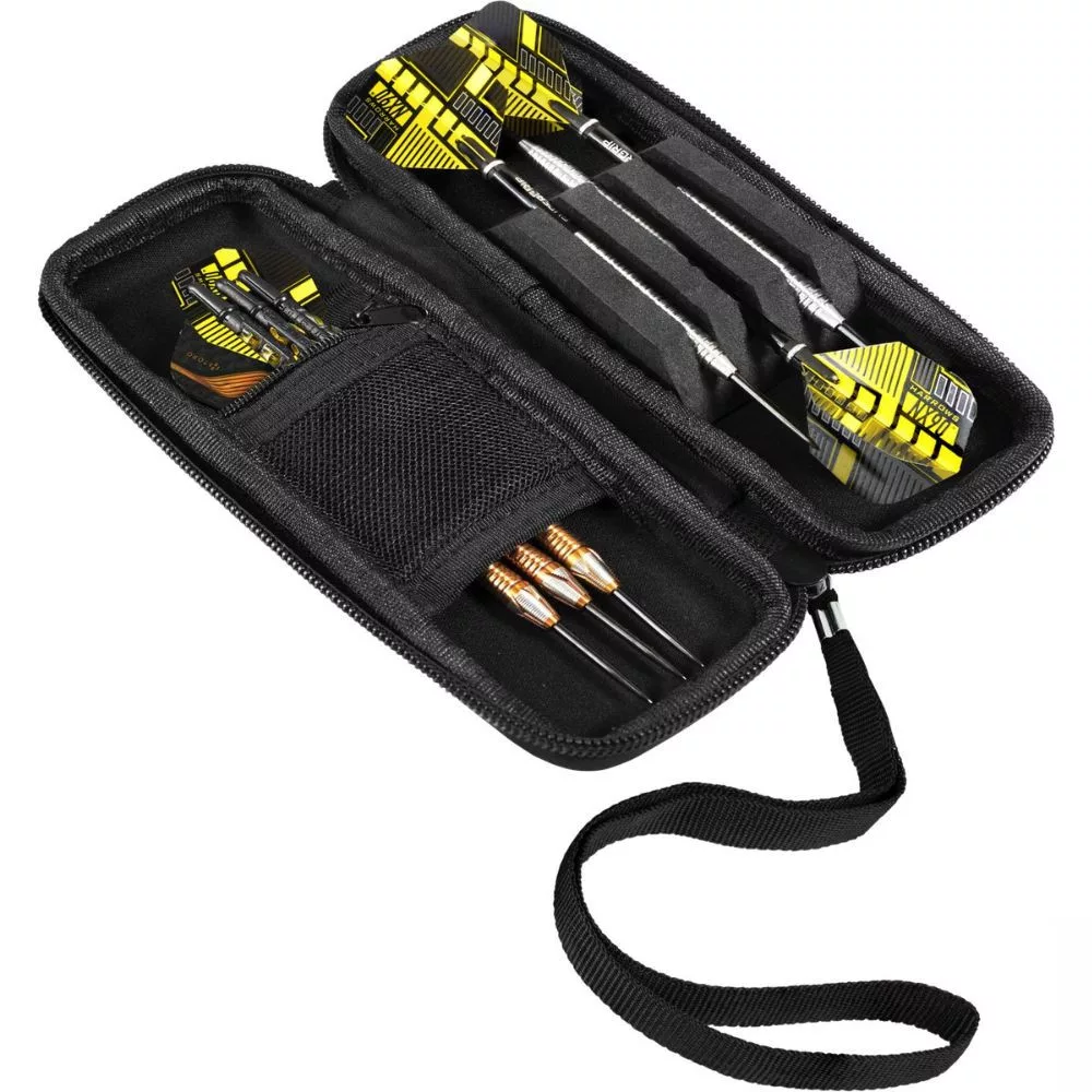 Pouzdro je navrženo tak, aby pohodlně pojmulo jednu kompletní sadu složených šipek (3 kusy) včetně letek, a zároveň nabízí místo pro drobné příslušenství jako náhradní násadky, letky nebo kroužky. Díky kompaktním rozměrům jej snadno vezmete do klubu, na turnaj i na domácí hraní.
