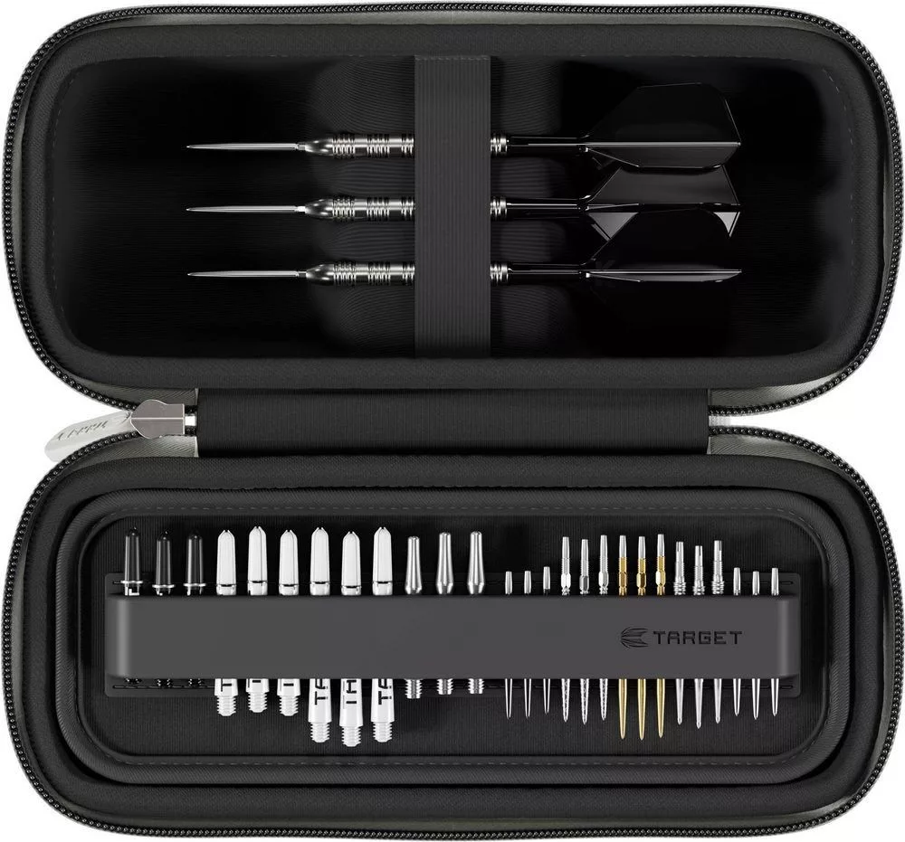 - Praktický organizér: Samostatné přihrádky na 12 shaftů, 15 Swiss Point hrotů, několik sad flightů, K-Flex doplňky i nářadí.