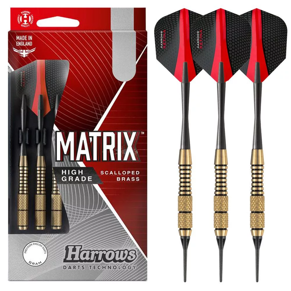 Prodejní balení obsahuje 3 kompletní šipky Harrows soft Matrix 18gK, Brass v tenkém plastovém obalu.