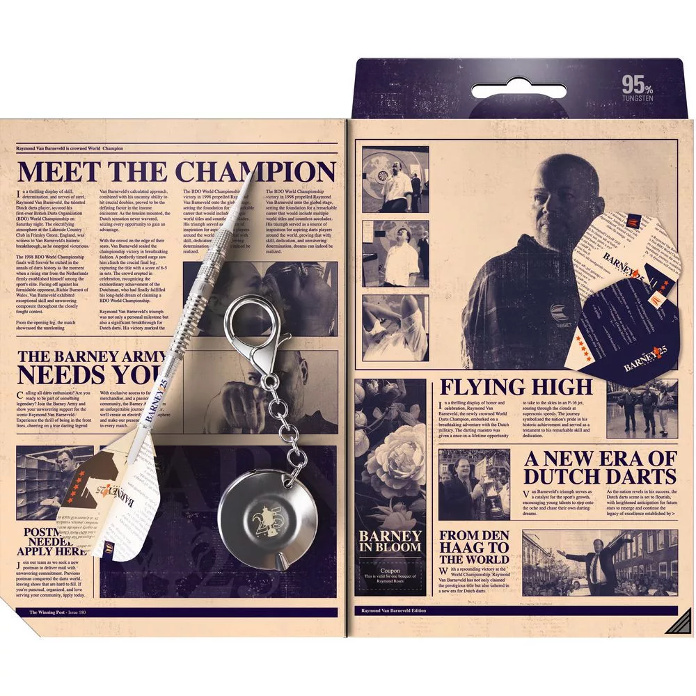 Na počest jubilejních 25. let od prvního vítězství Raymonda van Barnevelda na mistrovství světa s hrdostí představuje 95% wolframové šipky BARNEY25. Tyto šipky speciální edice jsou precizně navrženy pro všechny šampiony a jsou schváleny samotným legendárním RVB. Pozvedněte svou hru pomocí šipek, které nově definují přesnost.