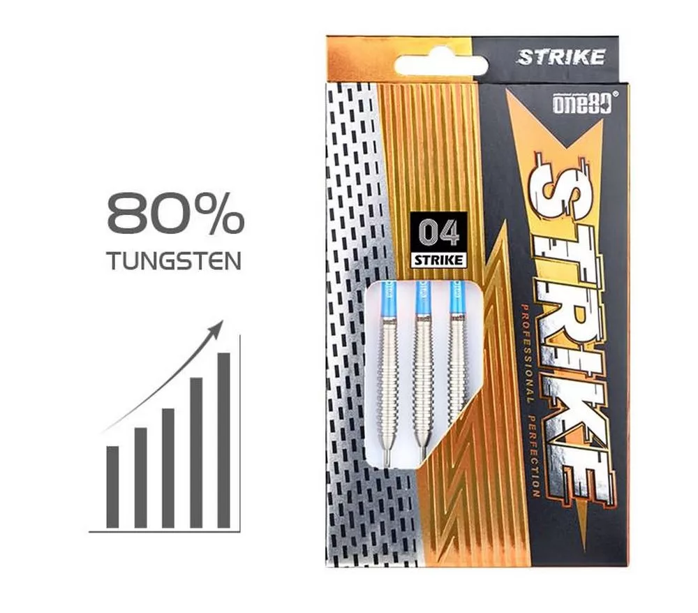 Strike 04 z řady ONE80 nabízejí vyšší průměr těla, pevný úchop a kvalitní zpracování z 80 % wolframu. Díky své hmotnosti 24 g a krátkému, silnějšímu tělu jsou ideální pro hráče, kteří preferují plnější pocit v ruce a lepší stabilitu při hodu.