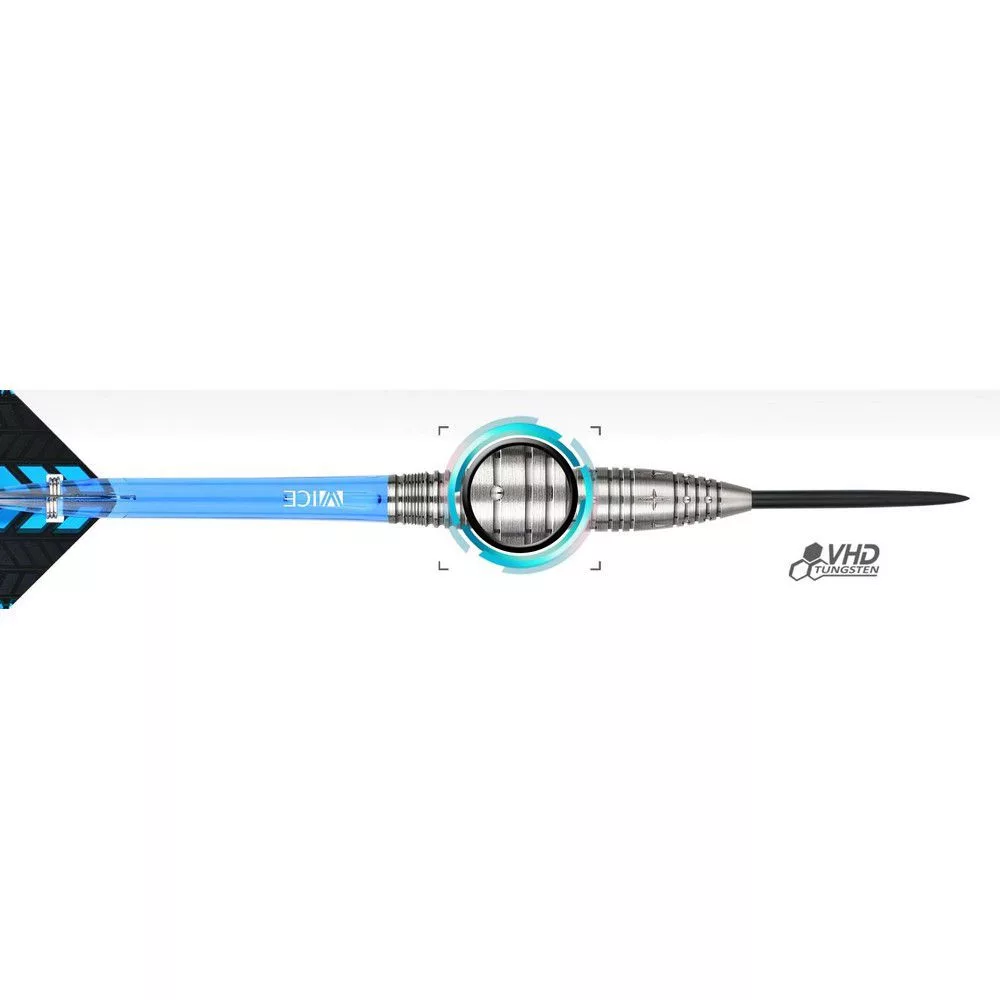 Profesionální sada steel šipek, s černými kovovými hroty, obsahuje také Vice dlouhé násadky a černo-modré letky. Tělíčka šipek jsou barevně rozdělena na více zón úchopu, které mají na sobě různé typy drážek.
