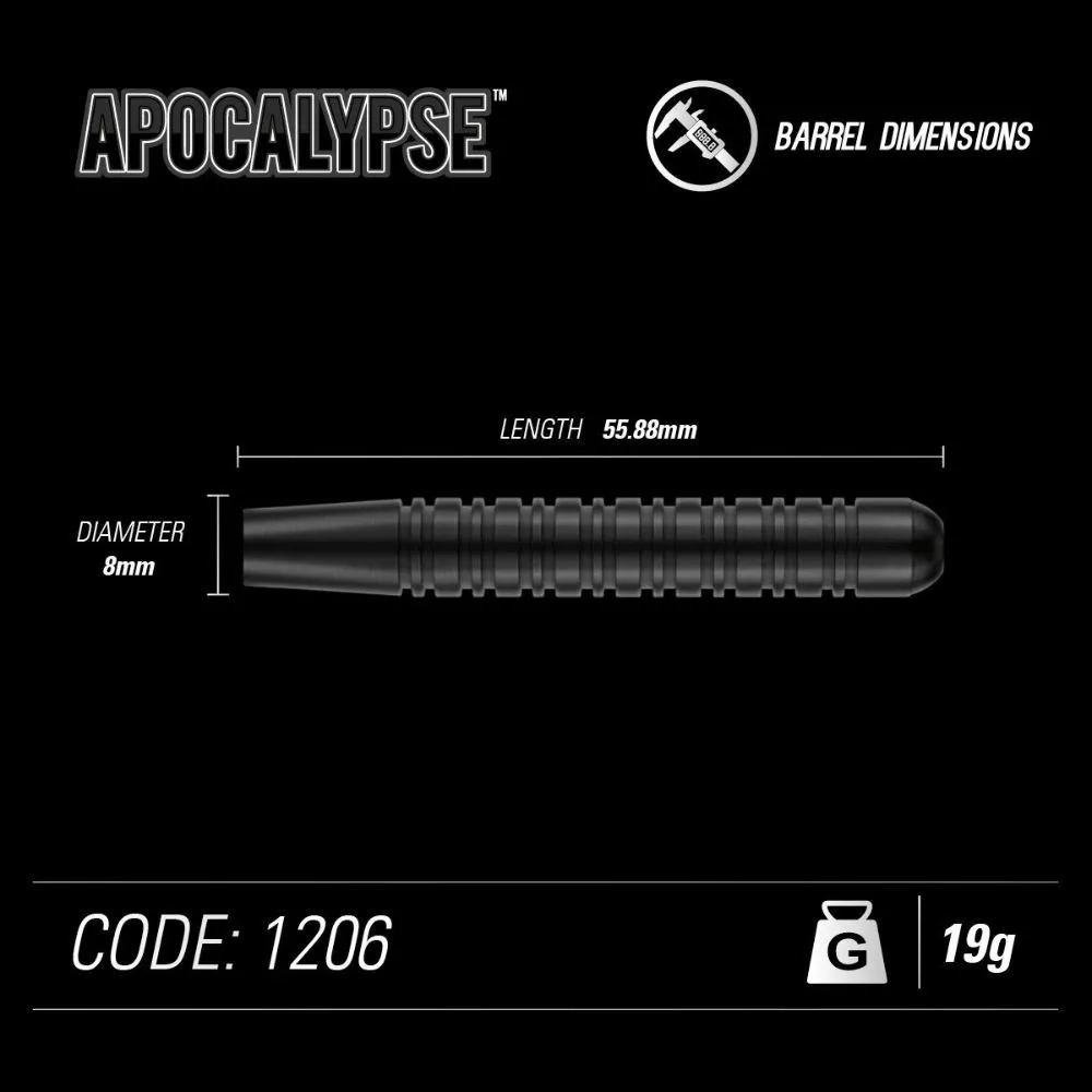 Sada šipek Apocalypse má stylovou a jedinečnou černou povrchovou úpravu ve spojení s výjimečnými výkonnostními charakteristikami. Apocalypse je kompletní řada šipek s univerzálním úchopem, která je připravena pomoci na začátku kariéry každého hráče.