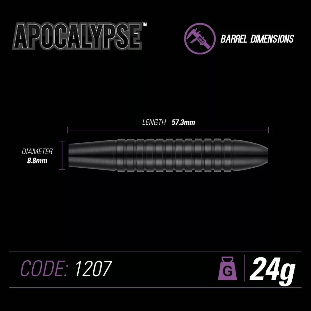 Sada šipek Apocalypse má stylovou a jedinečnou černou povrchovou úpravu ve spojení s výjimečnými výkonnostními charakteristikami. Apocalypse je kompletní řada šipek s univerzálním úchopem, která je připravena pomoci na začátku kariéry každého hráče.