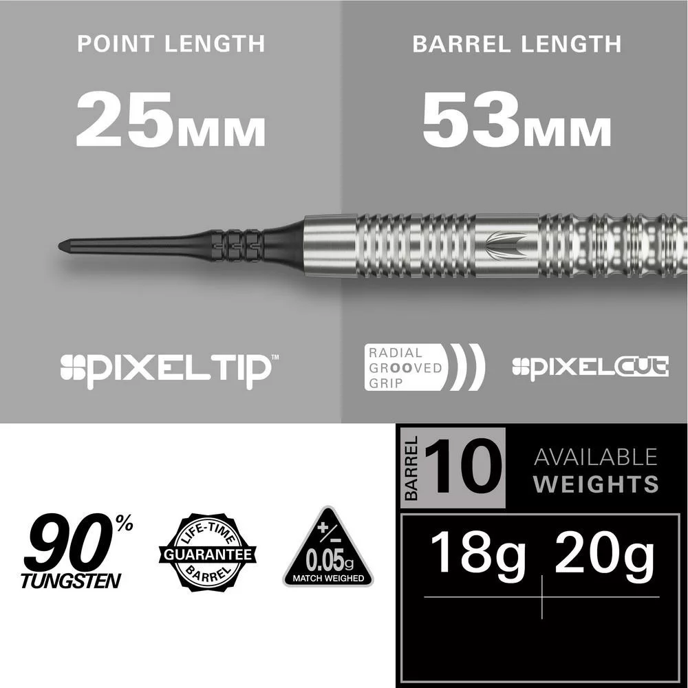 - Pixel soft tip hroty: Černé plastové hroty s 2BA závitem, navržené pro vysoký výkon a minimální odskoky od terče.
