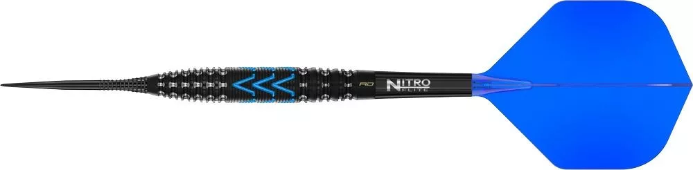 gripem, kontrolou a stylovým vzhledem. Charakteristické voltage-style frézování poskytuje jistý úchop, zatímco torpédový tvar zajišťuje plynulé a vyvážené hody. Tělo šipky je vyrobeno z