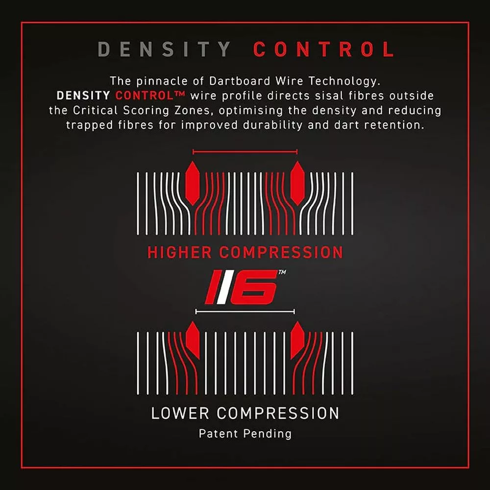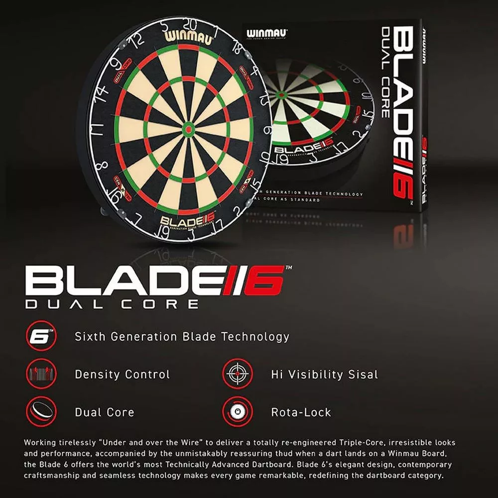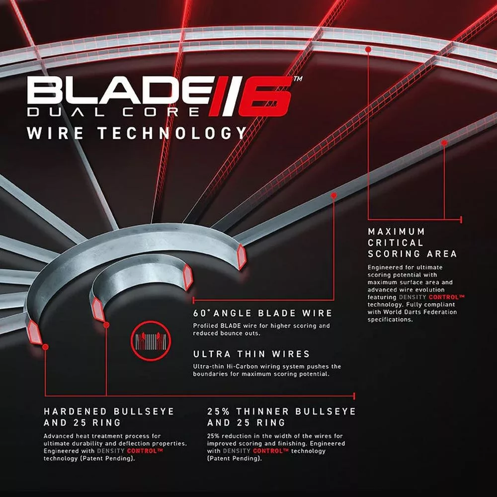 Blade 6 Dual Core je navržen pro hráče, kteří požadují dokonalost. Dvojitá hustota sisalu umožňuje hladké pronikání šipek do vnějších částí a zároveň pohlcuje kinetickou energii v jádru, čímž chrání vlákna před opotřebením. Ultra tenký drát se sklonem 60° navádí šipky přímo do cíle a minimalizuje jejich odrazy. Nový systém