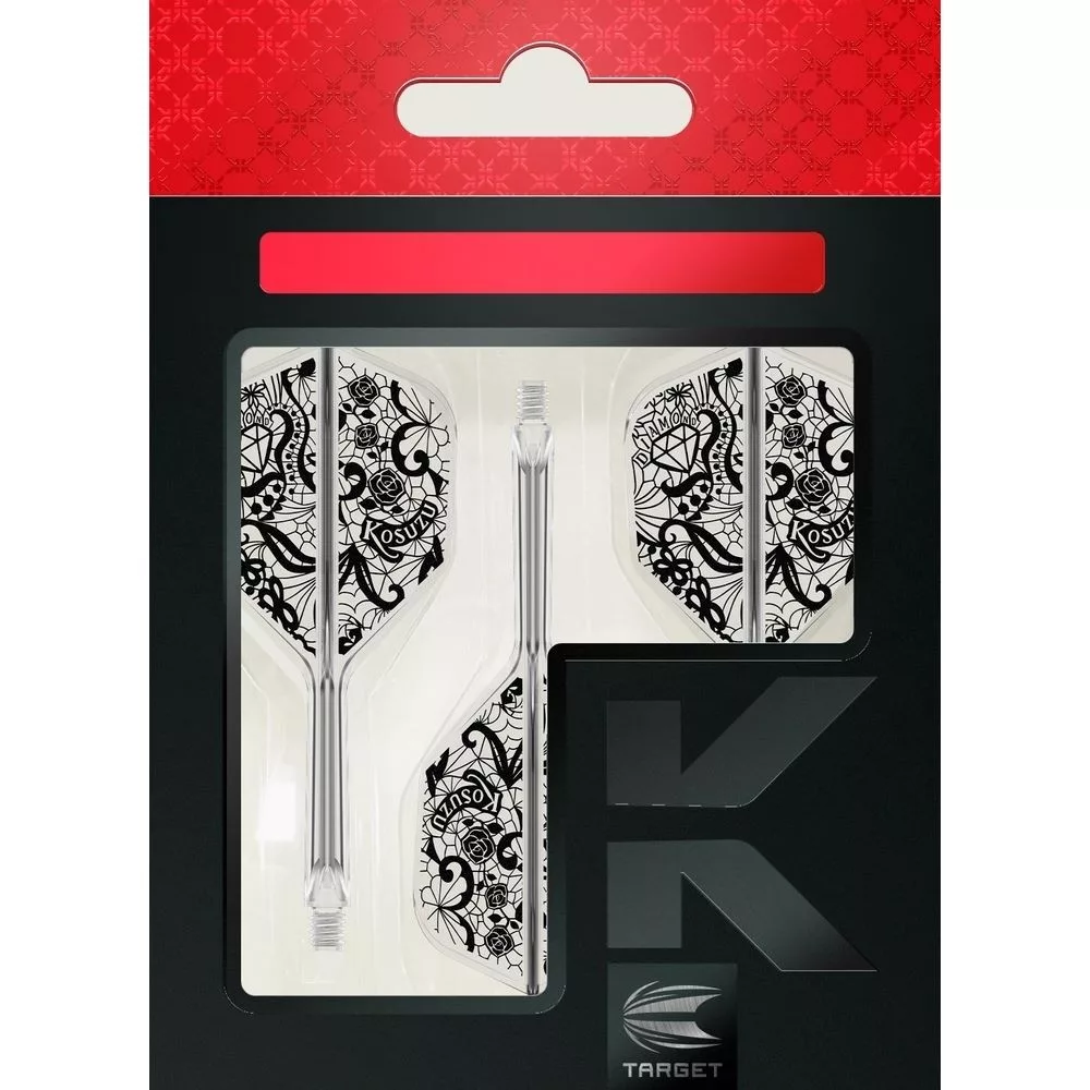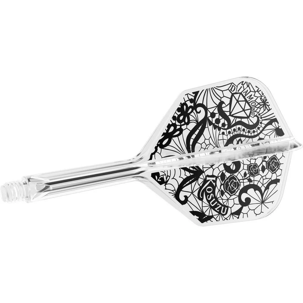 Černo-průhledné provedení s jemným krajkovým vzorem doplněným o diamantové a růžové motivy dodává šipkám jedinečný charakter. Tento design není jen estetický – podtrhuje preciznost a osobitý styl hráče.